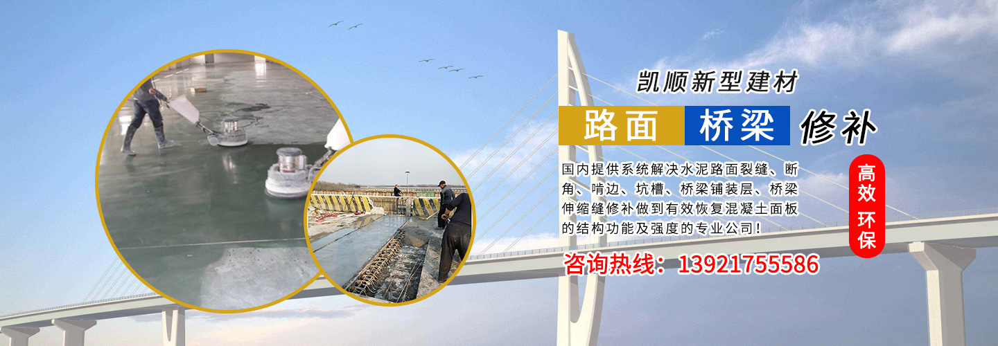江蘇凱順新型建材有限公司是專業(yè)混凝土路面/橋梁修補新材料研發(fā)、生產(chǎn)、銷售及全方位解決方案服務(wù)為一體的集成商,是路橋修補實現(xiàn)快速通行的企業(yè)! 江蘇凱順新型建材有限公司是國內(nèi)提供系統(tǒng)解決水泥路面裂縫、斷角、啃邊、坑槽、橋梁鋪裝層、橋梁伸縮縫修補做到有效恢復(fù)混凝土面板的結(jié)構(gòu)功能及強度的專業(yè)公司!為市政工程、高速、國道、省道、縣鄉(xiāng)道路的改造及大修、中修等大型工程提供了快速、高效、環(huán)保、經(jīng)濟系統(tǒng)方案和技術(shù)支持!
